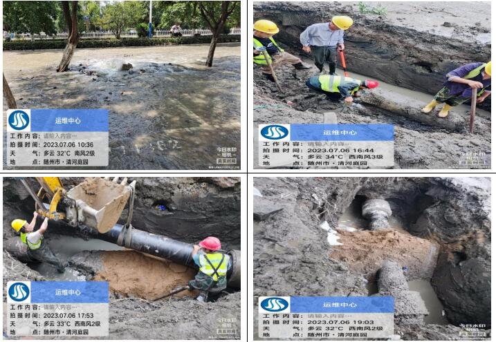 7月6日上午10點20分,客服人員接到群眾的熱線電話,告知清河路清河庭院附近路面大量跑水,運維中心搶修人員接到消息迅速前往,十五分鐘到達現(xiàn)場,通過專業(yè)技能和判斷,確定為DN400主管道爆破,測漏人員立即協(xié)助精準(zhǔn)定位漏點,盡量減少開挖面,為搶修爭取時間,該管道會直接影響周邊黃龍五隊、清河庭院、東方小區(qū)、楚苑小區(qū)、雙橋家具大市場等小區(qū)和企業(yè)大面積水小或停水。酷暑難耐,為盡快解決群眾用水問題,維修人員在35°高溫下連續(xù)奮戰(zhàn)8小時,于當(dāng)晚7點30分恢復(fù)正常供水,及時避免了周邊居民下班后正常生活用水的問題。