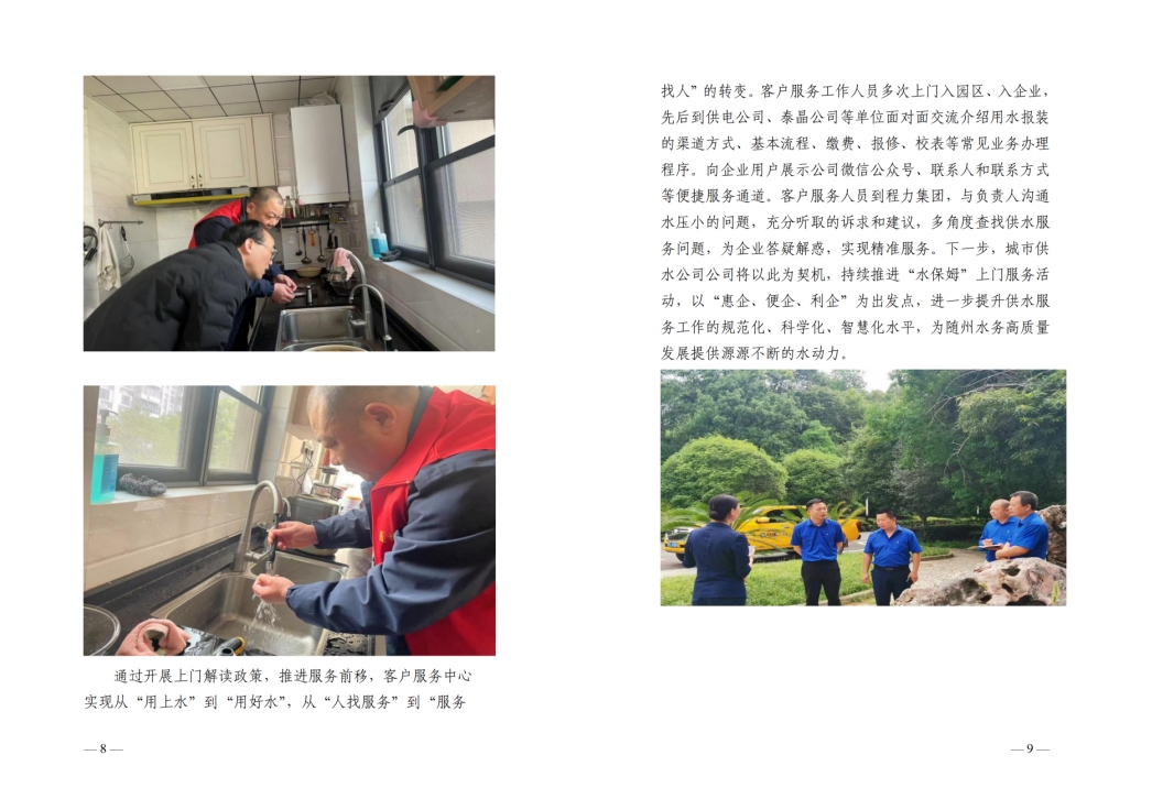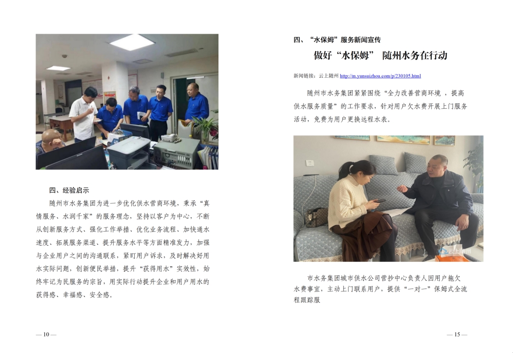為全面提升供水服務(wù)水平,優(yōu)化供水營(yíng)商環(huán)境,隨州水務(wù)集團(tuán)推出“水保姆”供水服務(wù)新模式,建立“供水服務(wù)網(wǎng)格員”隊(duì)伍,通過(guò)開展清表核查、網(wǎng)格劃分、聯(lián)合社區(qū)共同解決用戶問(wèn)題等亮點(diǎn)行動(dòng),讓百姓暖心,讓企業(yè)放心。
