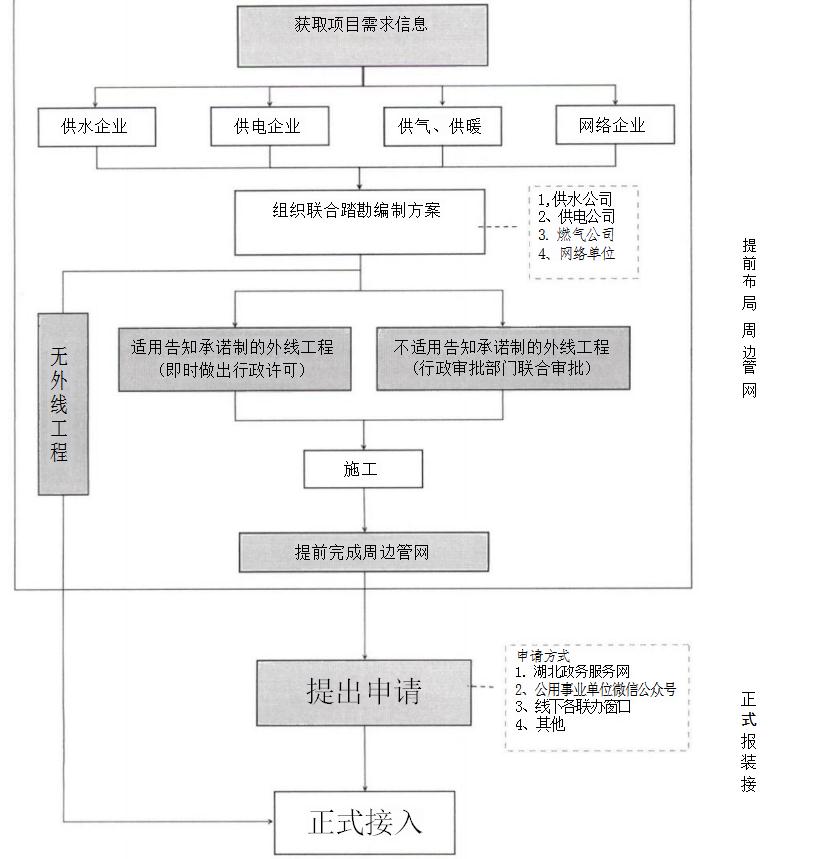5. 全面實現(xiàn)網(wǎng)上可辦。 依托湖北政務(wù)服務(wù)網(wǎng),實行企業(yè)網(wǎng) 上申請、資料線上傳遞、行政部門線上審批的全流程網(wǎng)上聯(lián)動報裝模式。